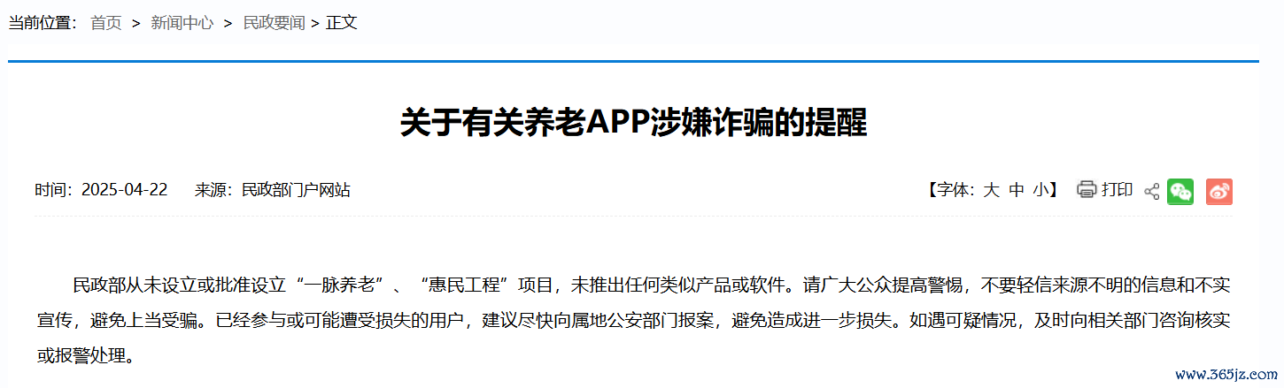 民政部:从未设立或批准设立“一脉养老”“惠民工程”项目 有关App涉嫌诈骗